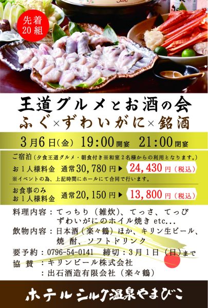 当館人気の還元祭、王道グルメとお酒の会(秋)の開催のお知らせをいたします。夕食は松茸×但馬牛のすき焼きを中心とした特別メニューと地酒や生ビールなど約2時間の飲み放題付き。とてもお得なプランになっておりますのでぜひお楽しみ […]