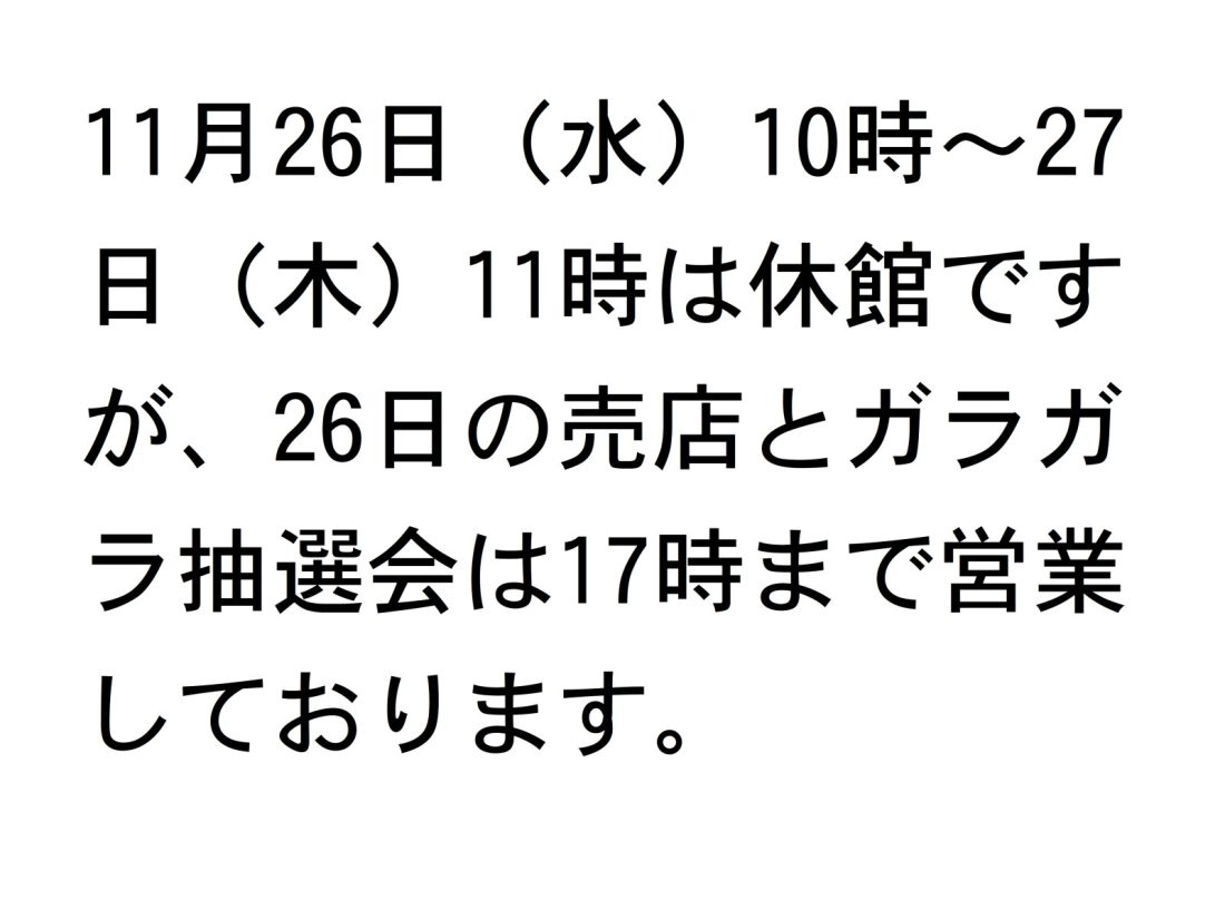 26日は17時まで売店とガラガラ抽選営業です。 Posted on 2025/10/252025/10/25 11月26日(水)10:00~27日(木)11:00は休館となりますが、売店とガラガラ抽選会は26日の17時まで営業しております。26日(フロの日)なので「温泉の素10入り」も割引価格1,100円(通常1,650円)にてお買い求めいただけます。