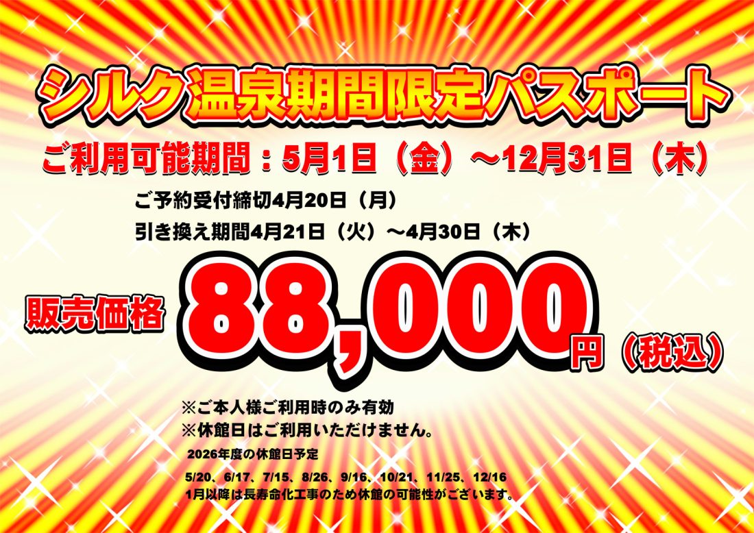 例年ご好評をいただいております「期間限定パスポート」を今年も販売いたします。 今年は5月から12月末までの「8ヶ月間」ご利用いただけるパスポートとなっております。